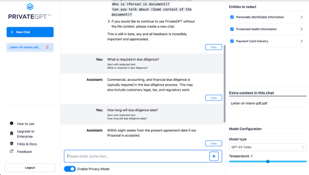 With the sensitive information removed, the text can still be usefully queried as demonstrated by the chat below, shown in PrivateGPT, a solution that removes the selected information and re-populates the output for a seamless user experience: