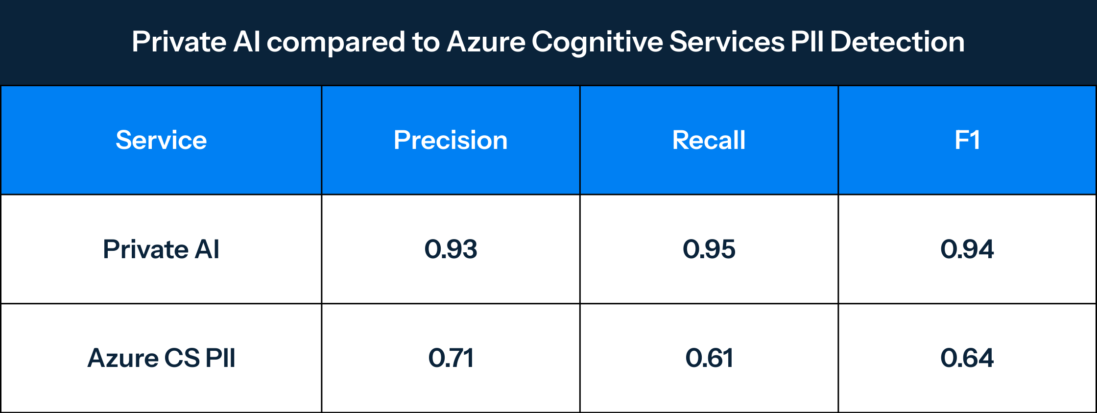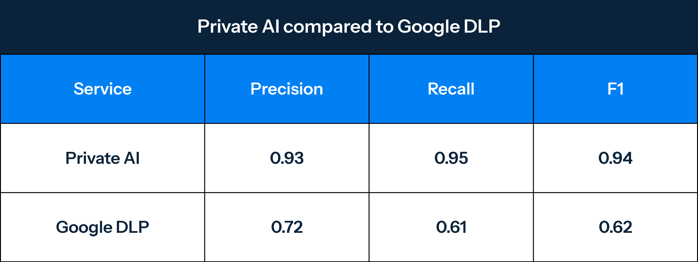 When you've spent 6 years purpose-building a solution specifically for PII detection challenges, recall becomes the critical metric for evaluating performance.  For our customers, missed PII is a significant event that can lead to severe consequences, such as data breaches, identity theft, or legal implications. Therefore, we aim to minimize the number of false negatives, or missed PII, in order to provide our customers with the best possible protection and peace of mind.