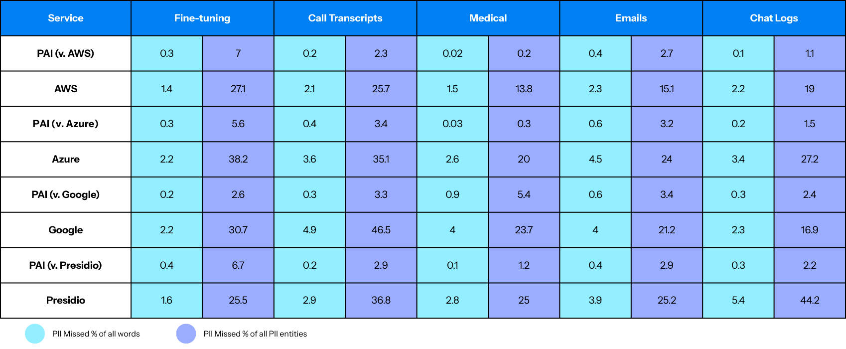 These results show that general-purpose market solutions are missing between 13.8% and 46.5% of PII entities in real-world data, while the purpose-built, specialized approach misses between 0.2% and 7% across the same datasets.